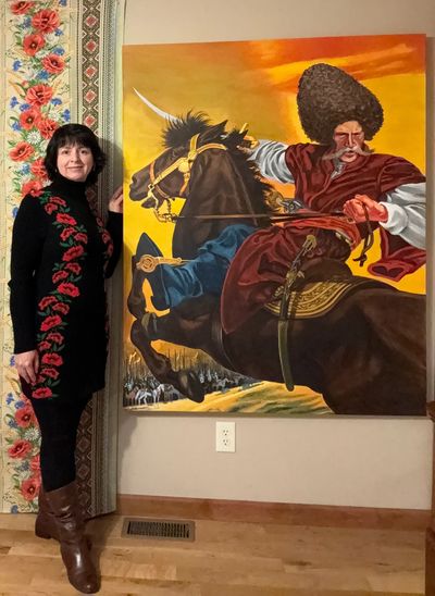 Multi-talented and local Ukrainian artist Oxana painted this Ukrainian Kozak on a horse representing the will and power to defend Ukraine from invaders.